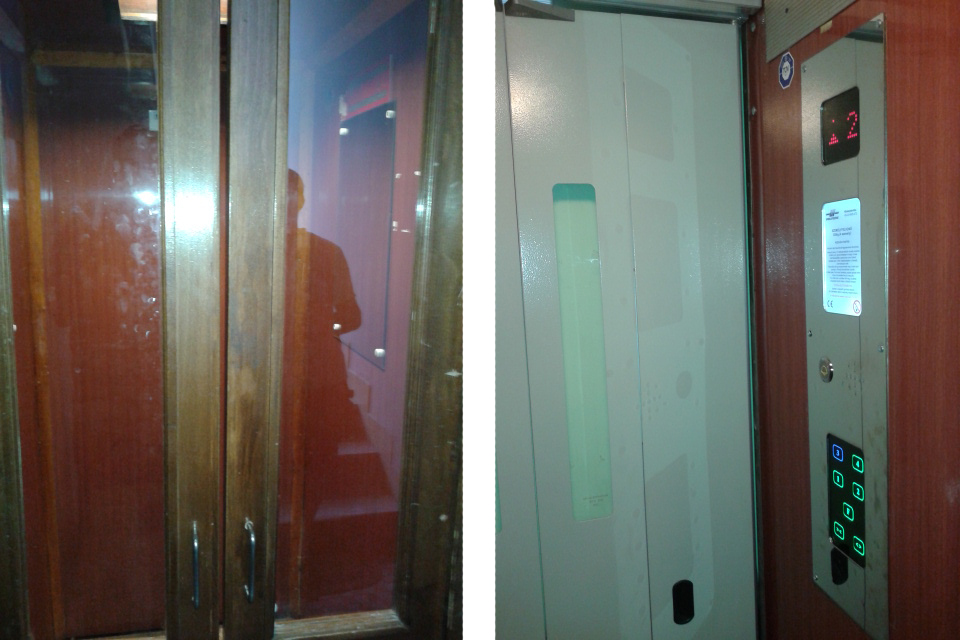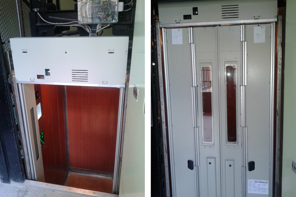 Régi kézi működésű fa fülkeajtó cseréje új esztétikus automata fülkeajtóra az új szabvány előírásai szerint.