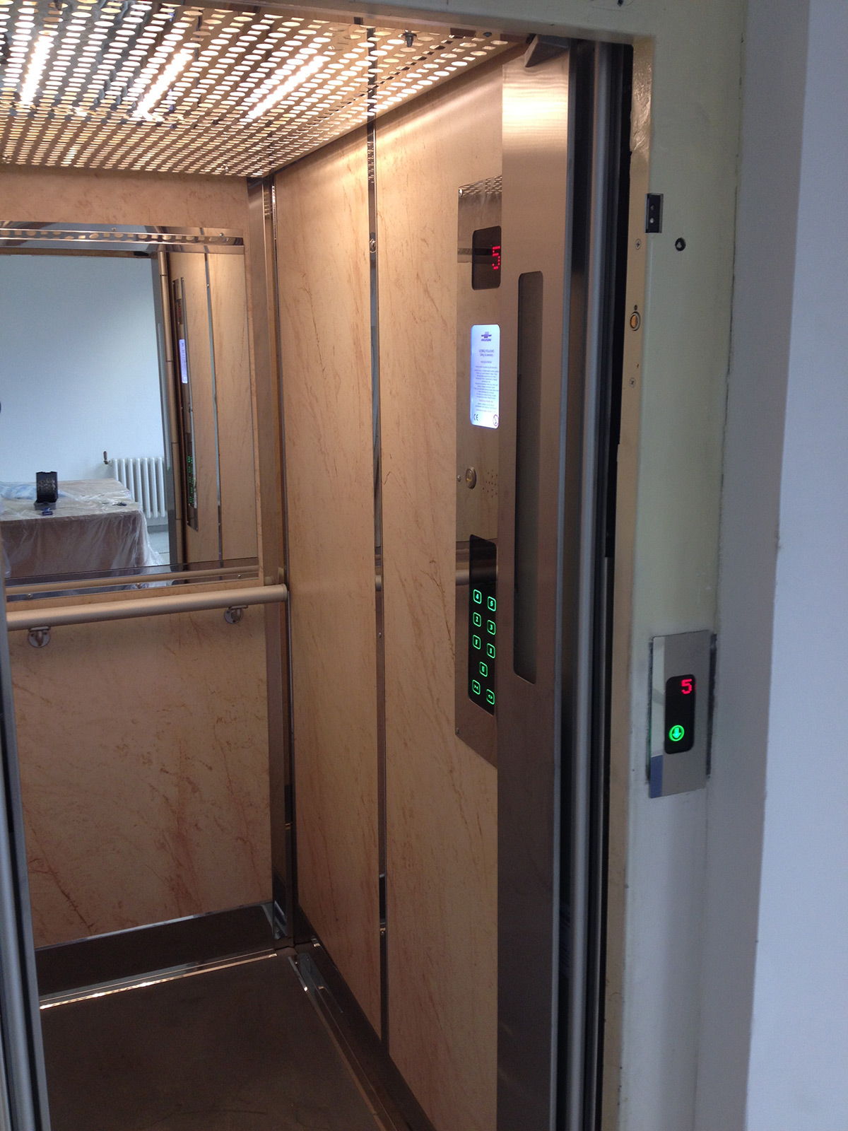 fülkeajtó beépítés, felvonó felújítás, felvonó fülke burkolás