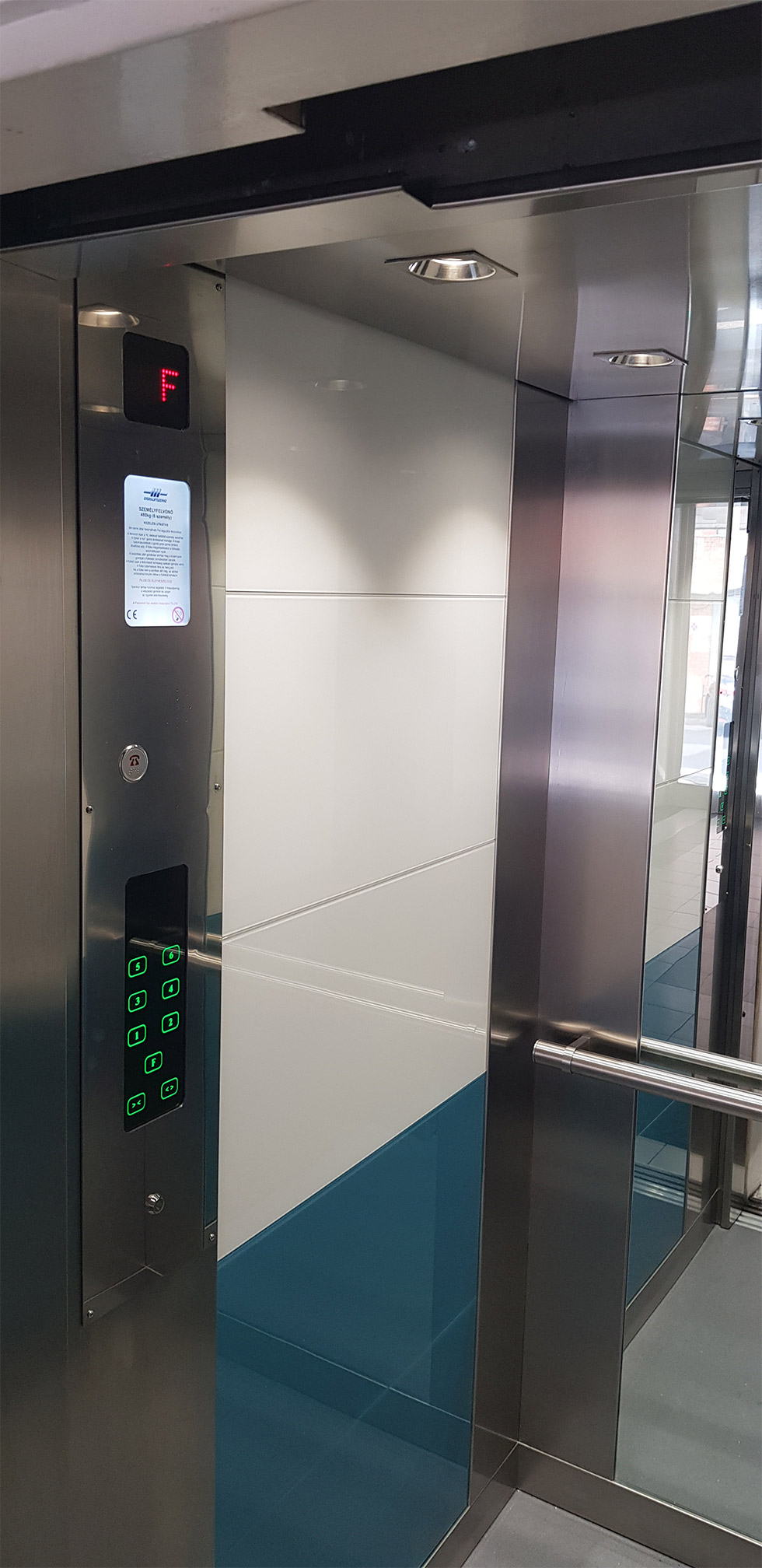 Harmadik ütem: felvonó fülke burkolása egyedi tervezés alapján, üveg burkolattal, süllyesztett világítással.
